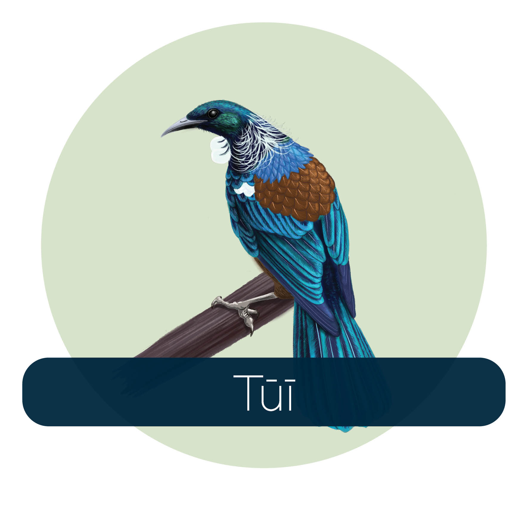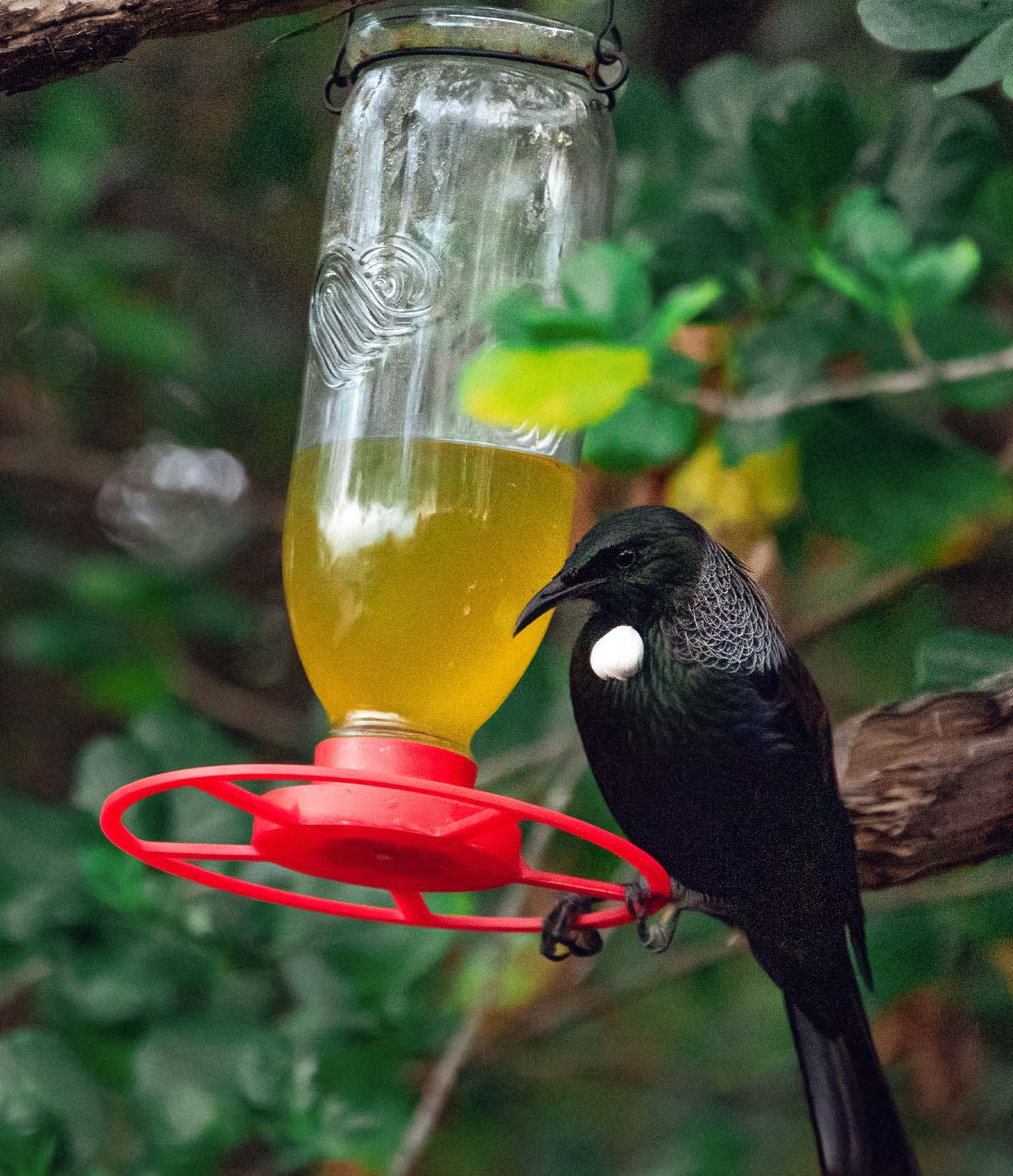 Easily identified by its iconic white poi and blue-black feathers, the tūī is one of the most likely native species to visit a Nectar Feeder.
